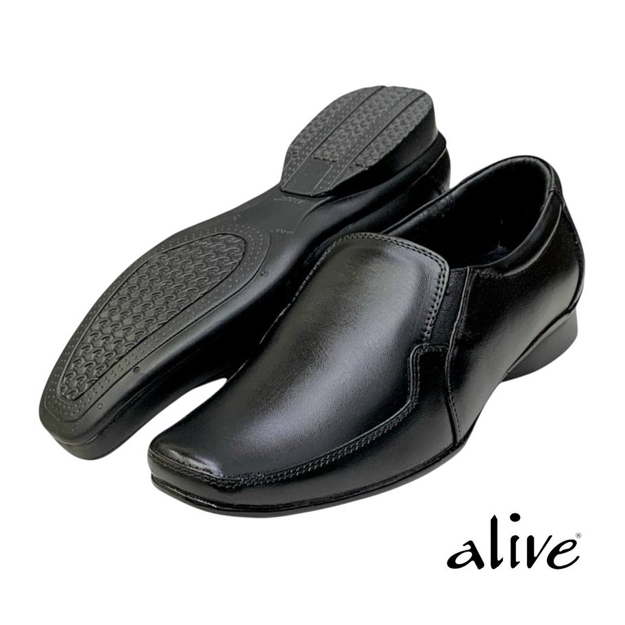 Alive black leather slip-on formal shoe for men with cushioned insole, air-mix build, and alert sole. Sleek modern design for office & events.